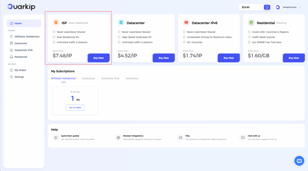 Once you’ve selected your plan, follow QuarkIP’s setup guide to configure the proxy on your device or browser. You can easily integrate the proxy settings into your device’s network settings or use a proxy extension for your browser.